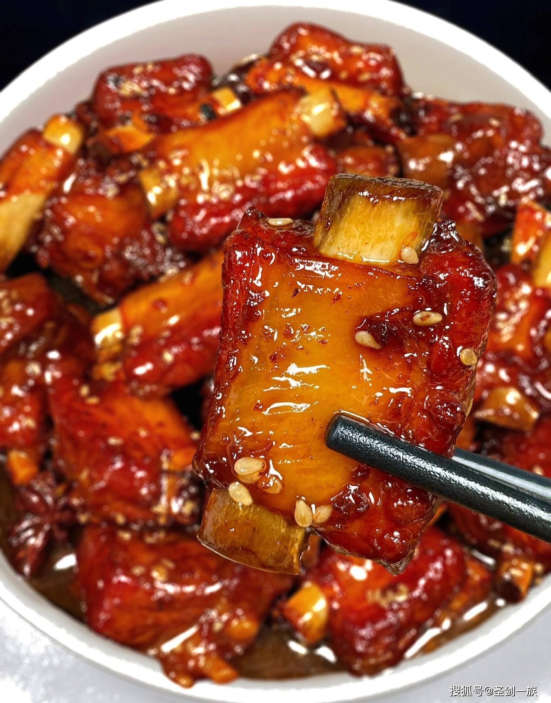 8. 倒入炸好的茄子,翻炒均匀后倒入酱汁,煮至汤汁浓稠即可。糖醋排骨