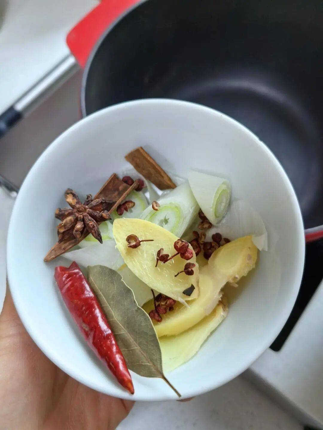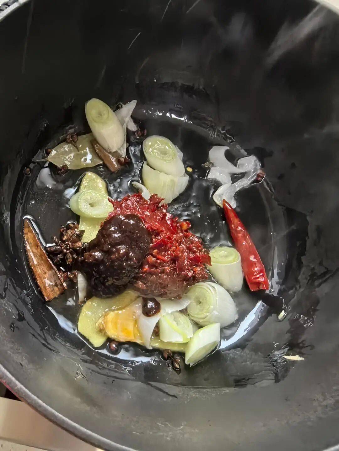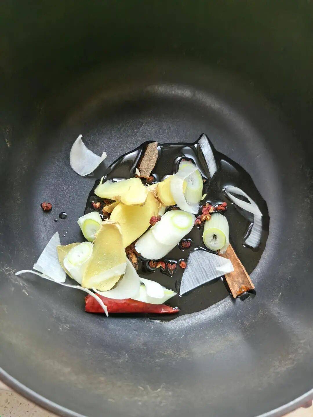 - 干料组合:花椒、大料、香叶、桂皮、干辣椒提供基础香味,铸铁锅少油炒香后激发香气。