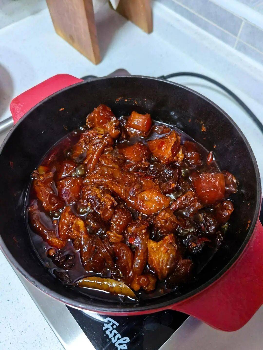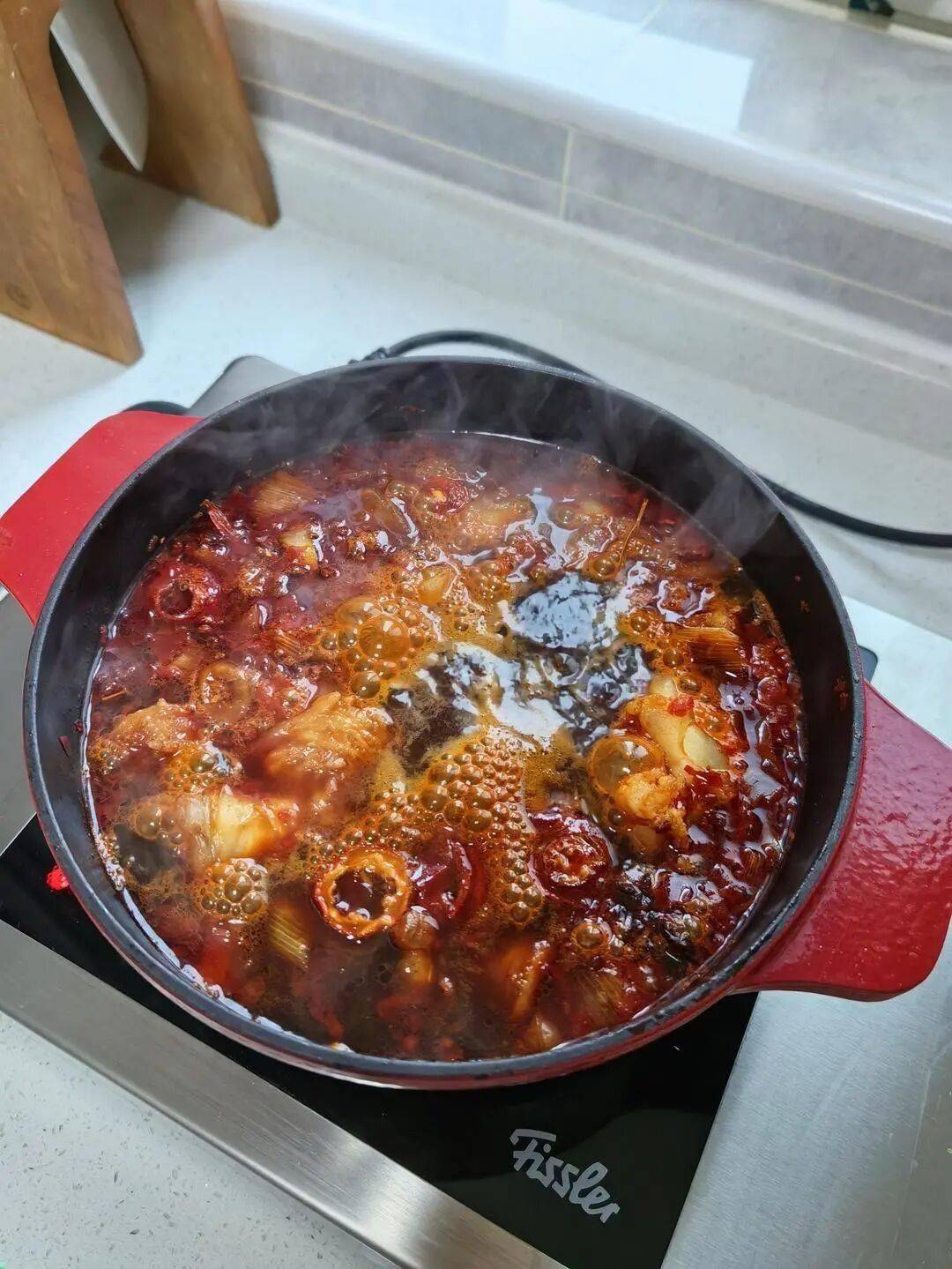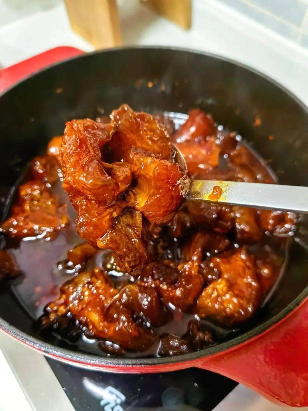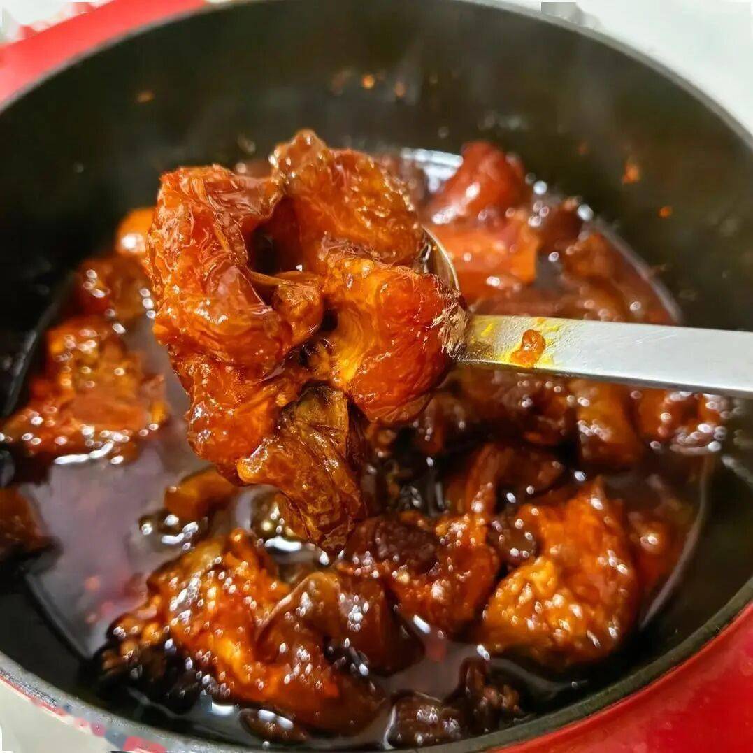 - 生抽(4勺)、老抽(2勺)调色,冰糖(1把)中和辣味并提亮色泽。
