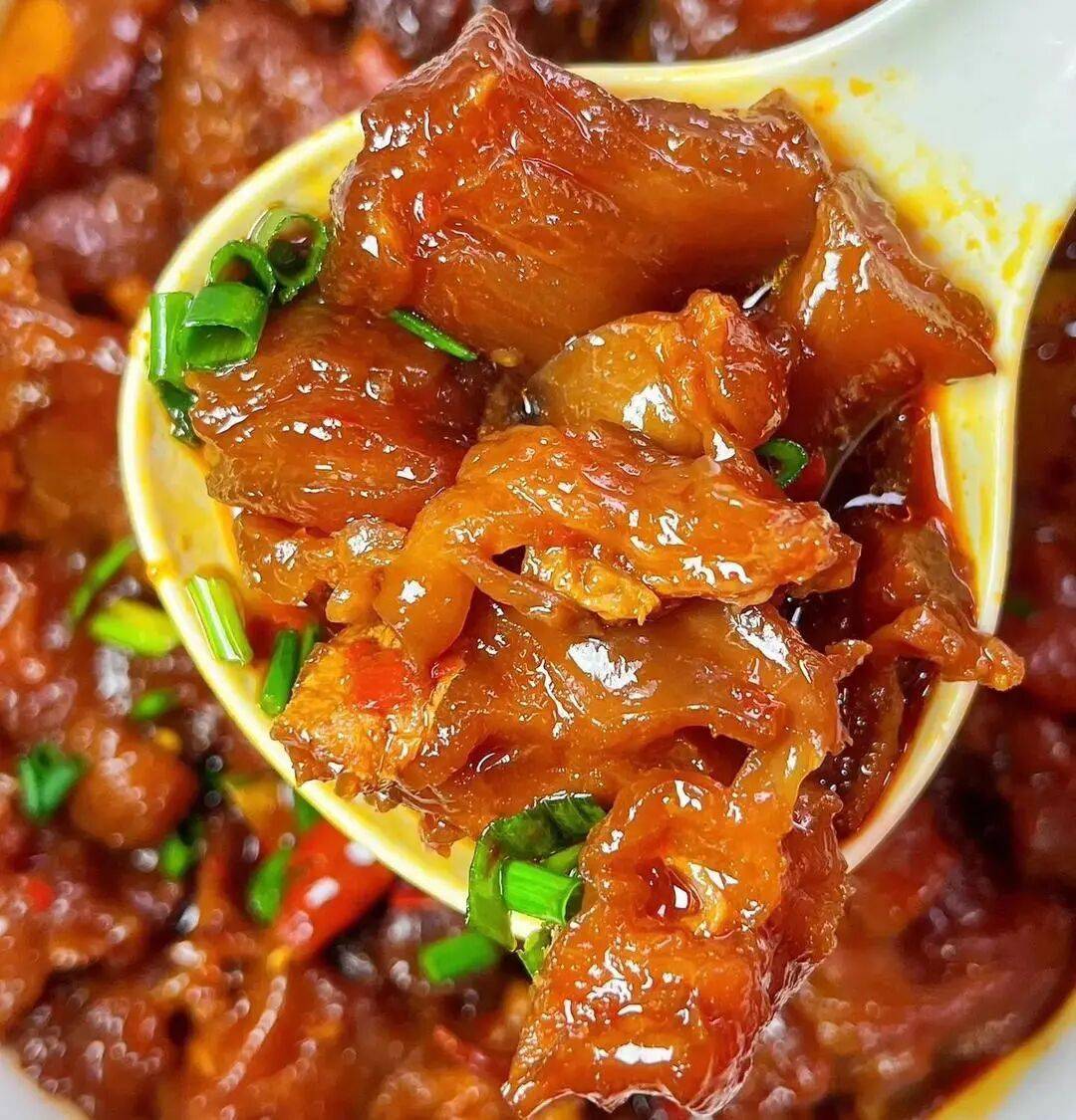 更妙的是,丰富的胶原蛋白,赋予了牛蹄筋迷人的的“糊嘴”口感。尤其慢火炖透后,裹着浓稠酱汁,入口弹糯又带劲,嚼着满是胶质的鲜香。不管是配米饭、下面条,还是冷吃下酒,都别有一番滋味。