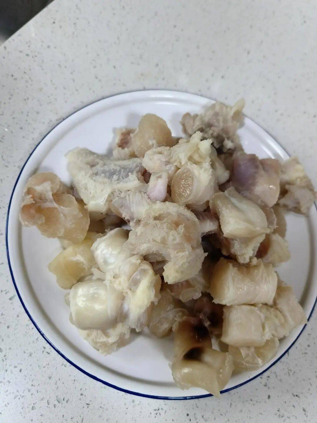 - 蹄筋切小块(2-3cm最佳,高压锅可缩短时间),冷水下锅加葱姜料酒焯水10分钟,捞出后手动夹除残留黑毛。