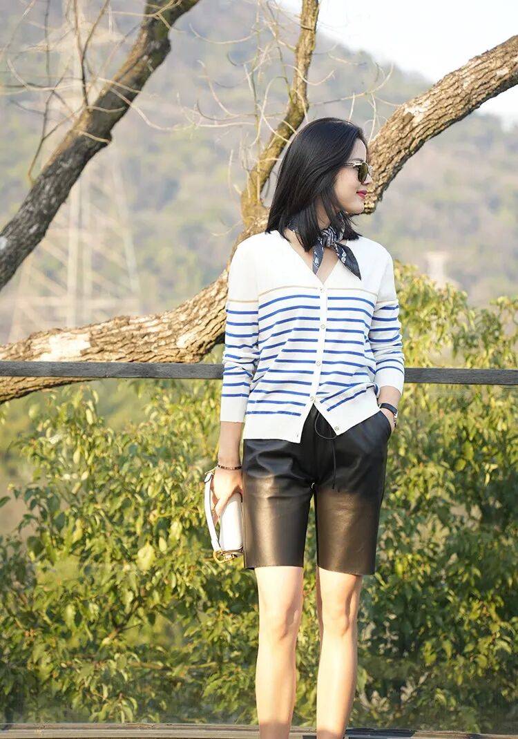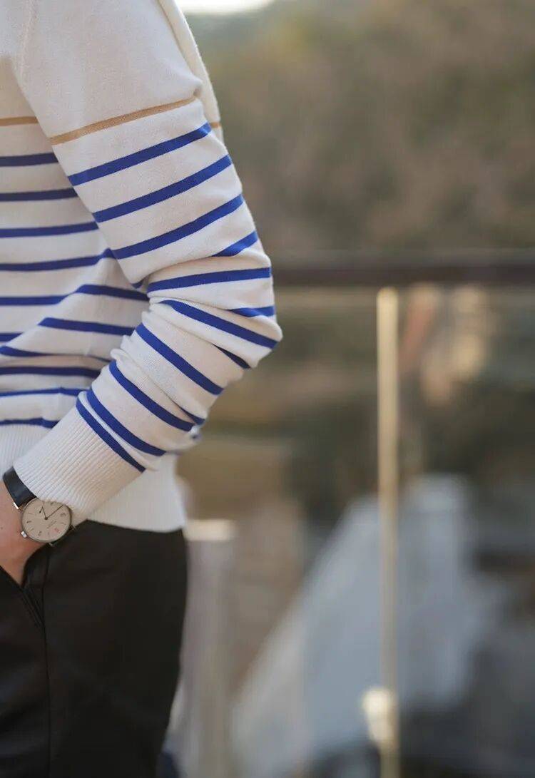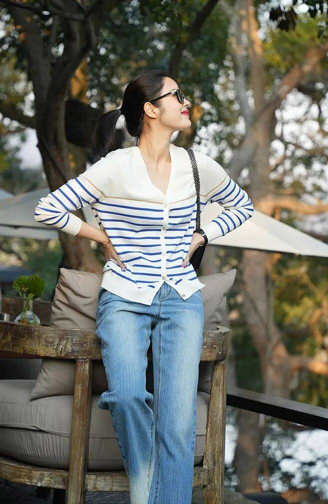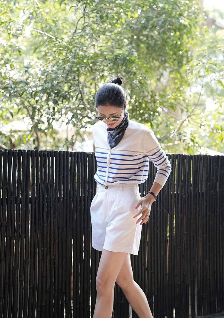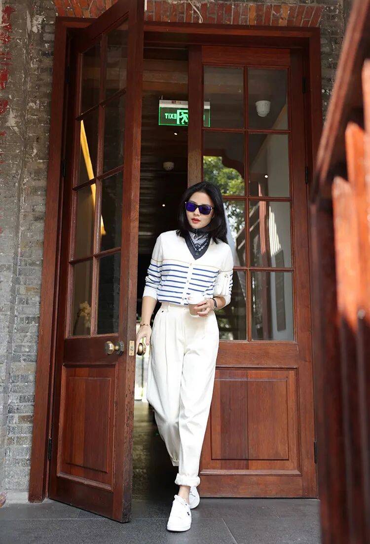 叠穿增加层次,竖条纹显修长,避免针织背心的臃肿;