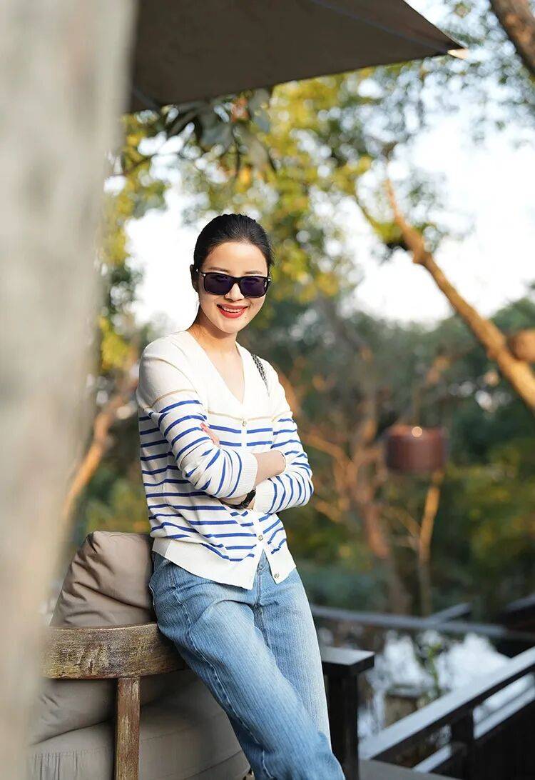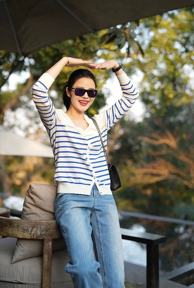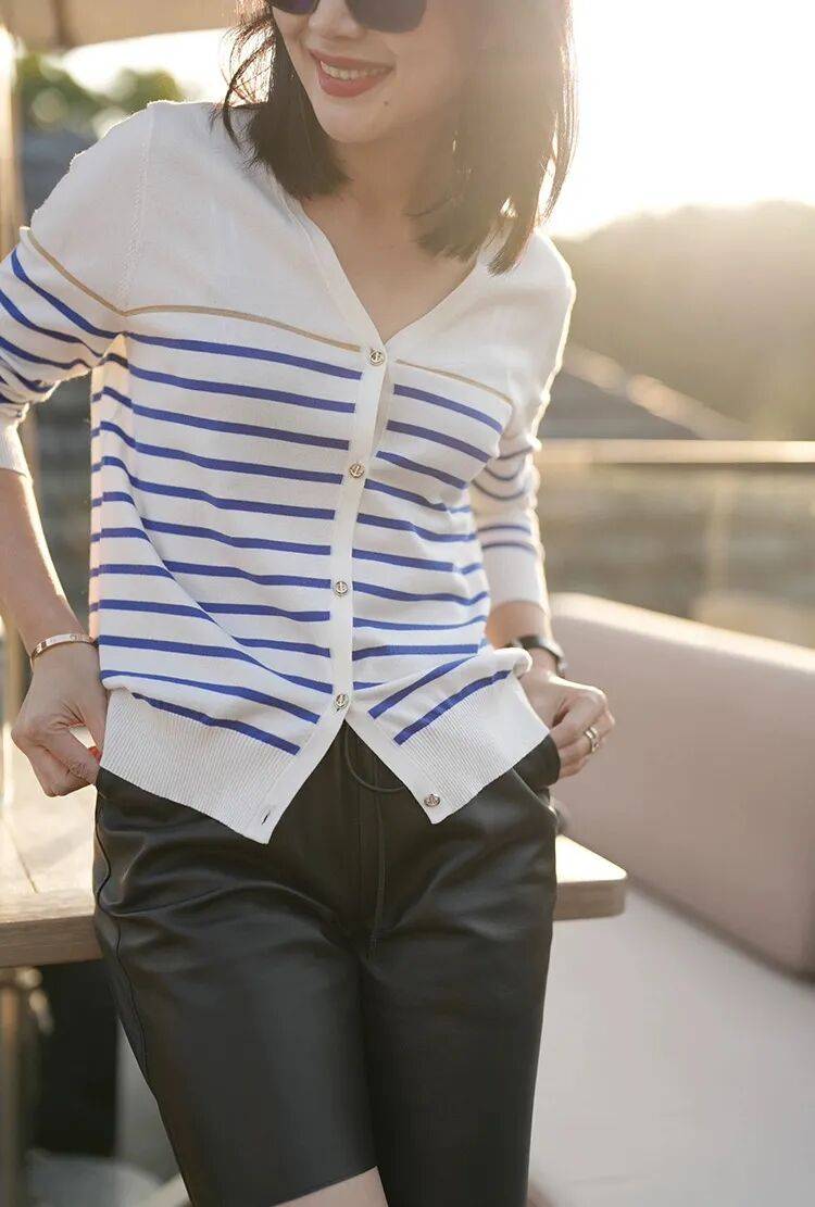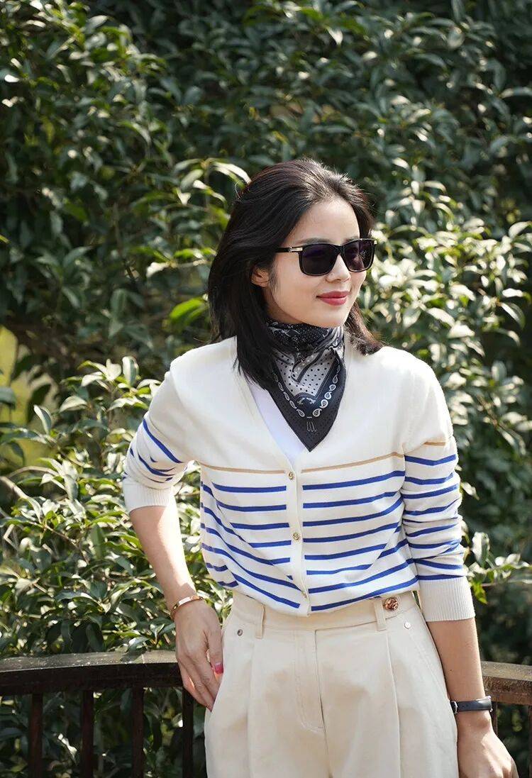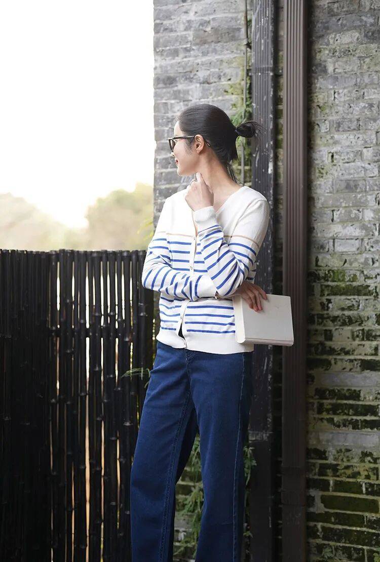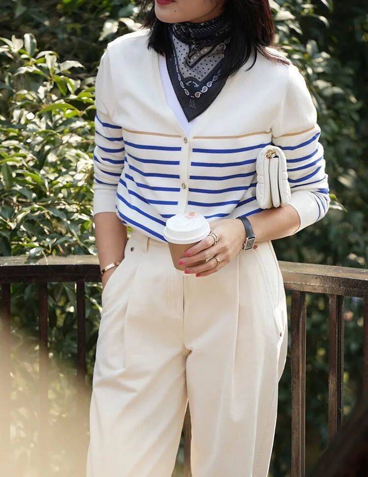 单品:大地色针织背心(卡其/驼色,质感柔软)+ 竖条纹衬衫(白色/浅蓝色,天丝材质)+ 高腰阔腿裤(黑色/深灰色,垂坠感)+ 粗跟小皮鞋(黑色/裸色)。