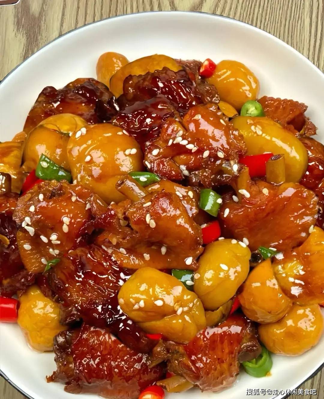 4. 板栗烧鸡:这道菜是秋日限定的美味,板栗和鸡肉的搭配鲜香可口。生板栗用开水浸泡5分钟更容易去皮。