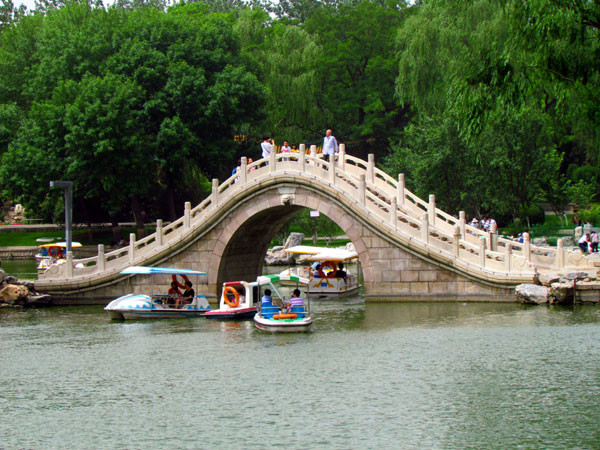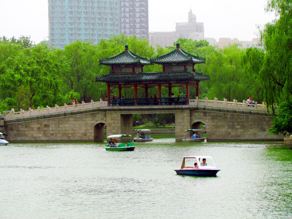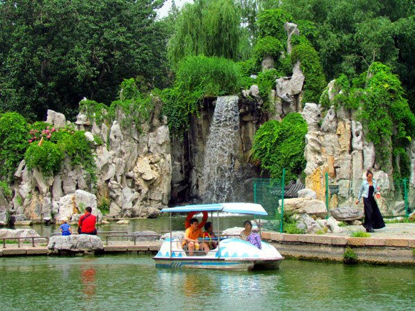 湖中石拱桥、双亭桥和龙潭瀑布把湖分成四个小岛、四个半岛、三个浅滩、一个峡谷、六块桥头绿地。人们在湖中荡舟,可以观赏湖光景色、亭台殿阁。