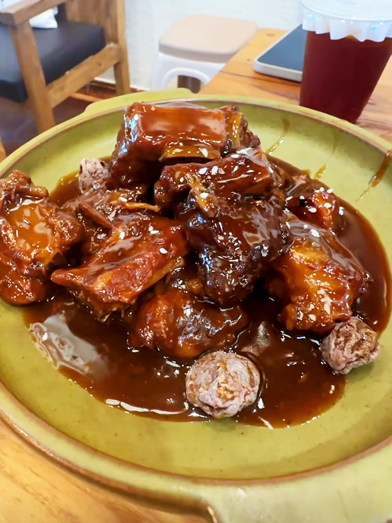 - 话梅排骨:酸甜比例恰到好处,话梅的果香完全渗入排骨,肉质酥烂脱骨,却丝毫不腻。吃完一块忍不住舔手指,连平时不爱甜口的同伴都直呼“上头”。
