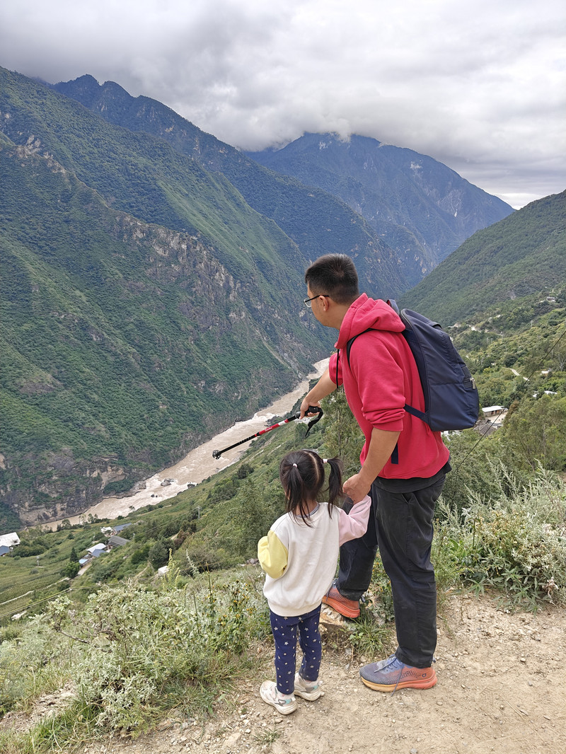 从纳西雅阁出发,沿金沙江徒步6小时至民宿。山路陡峭,但沿途风景壮阔,更因与佛山夫妇的“食聊”冲淡了疲惫: