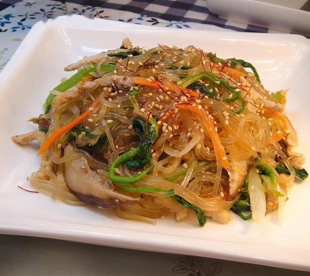 用料红薯细粉绿豆芽胡萝卜菠菜黑木耳鸡蛋小香葱末蒜末白芝麻生抽、盐、白糖白胡椒粉辣椒油