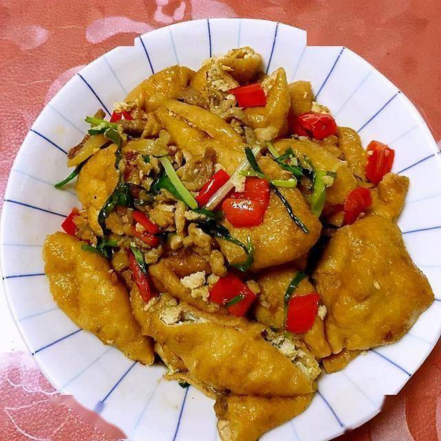 3.将油豆腐入锅一同翻炒几下后,调入盐、生抽、老抽调味,锅内倒入小碗高汤(高度约为材料的二分之一处),将煸香的肉片铺在油豆腐上,锅内材料掂匀加盖焖煮。