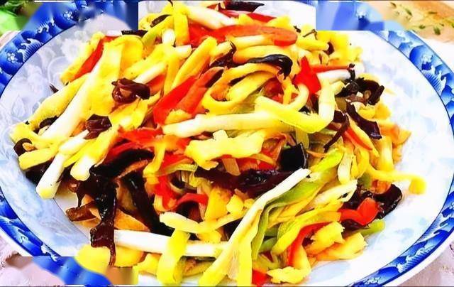 2、绿尖椒、胡萝卜、冬笋分别切细丝,黑木耳泡软洗净切细丝备用。