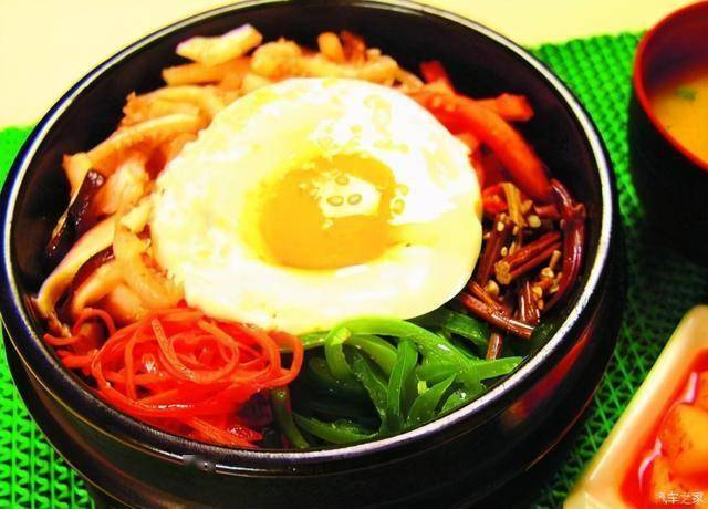 2、准备配菜的同时淘米煮饭,将煮好的米饭盛入容器,分别摆上各式蔬菜、韩式辣白菜、牛肉丝炒香菇,然后煎一个太阳蛋,加韩国辣酱和适量香油,接着就可以边拌边吃了。