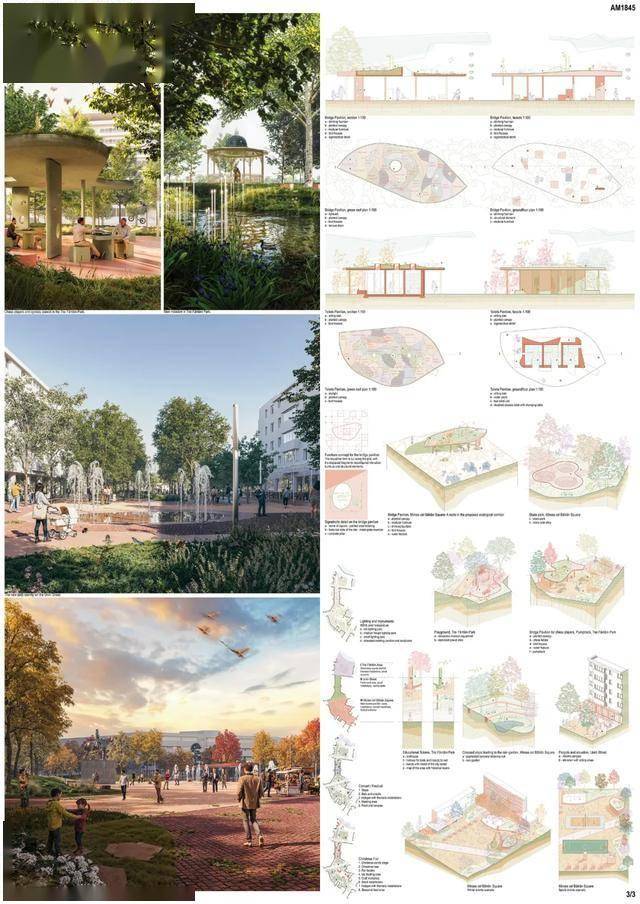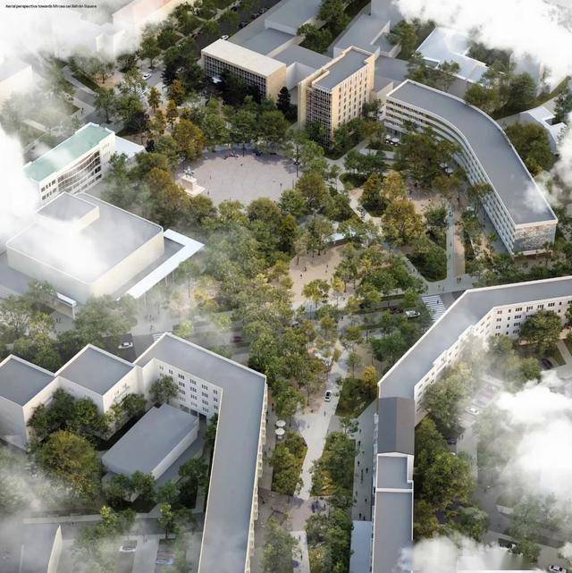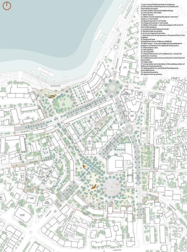 - 放射状人行通道连接城市肌理:从广场延伸出多条步行街道,连接老城区、河岸步道(毗邻多瑙河三角洲入口)、公交枢纽与住宅区,形成“步行引力场”,提升其作为城市磁极的辐射能力。