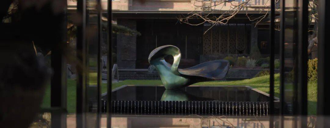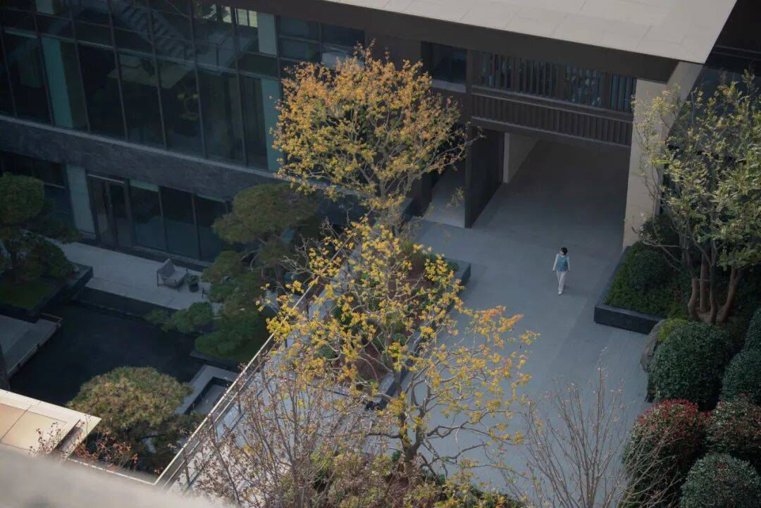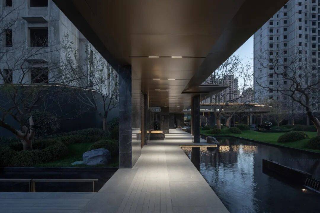80米风雨连廊,“光影婆娑,枫枝摇曳”。归家之路如漫步艺术展廊,风雨无阻。廊外草坪缓舒,一池静水映天;艺术雕塑以灵动线条演绎人与自然共舞的形态,在光影雕琢下成为立体画卷。
