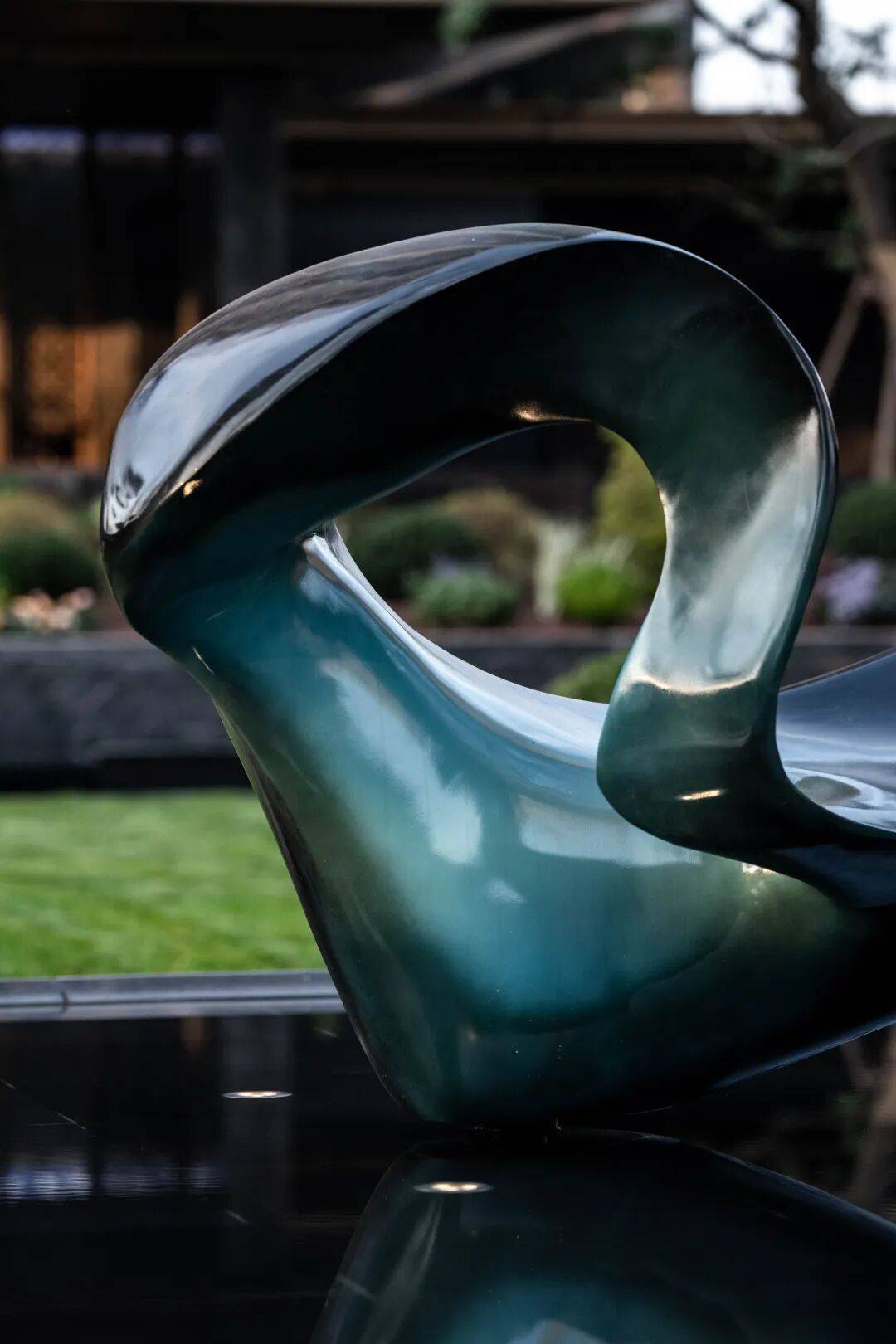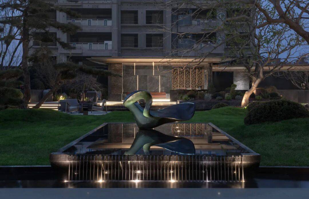 高台依水而建,“静听流泉”。此处是社交与独处的理想空间:可烹茶会友,亦可独坐观景。水岸中央,“瑞意舞者”雕塑翩然矗立,其形抽象灵动,如天地间自由的呼吸。陶蕴黑玉材质的运用,使厅堂更显温润雅致,“生活之雅,在此静默生长”。