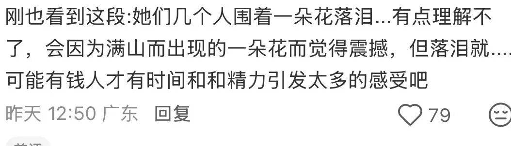 除了与嘉宾互动方面的问题,章泽天在分享自身经历时也遭到诟病。她讲述自己不丹徒步经历,称被一株开在大树上的花感动到哭,可输出内容略显匮乏。还是刘嘉玲帮忙升华,说应该有那朵花的精神,即便如此,网友对她的感动落泪并不买账,觉得无病呻吟。这背后反映出豪门身份带来的影响,普通人光是活着就拼尽全力,而豪门一点情绪波动都可能被质疑与金钱堆砌有关,毕竟不丹之行花费不菲。