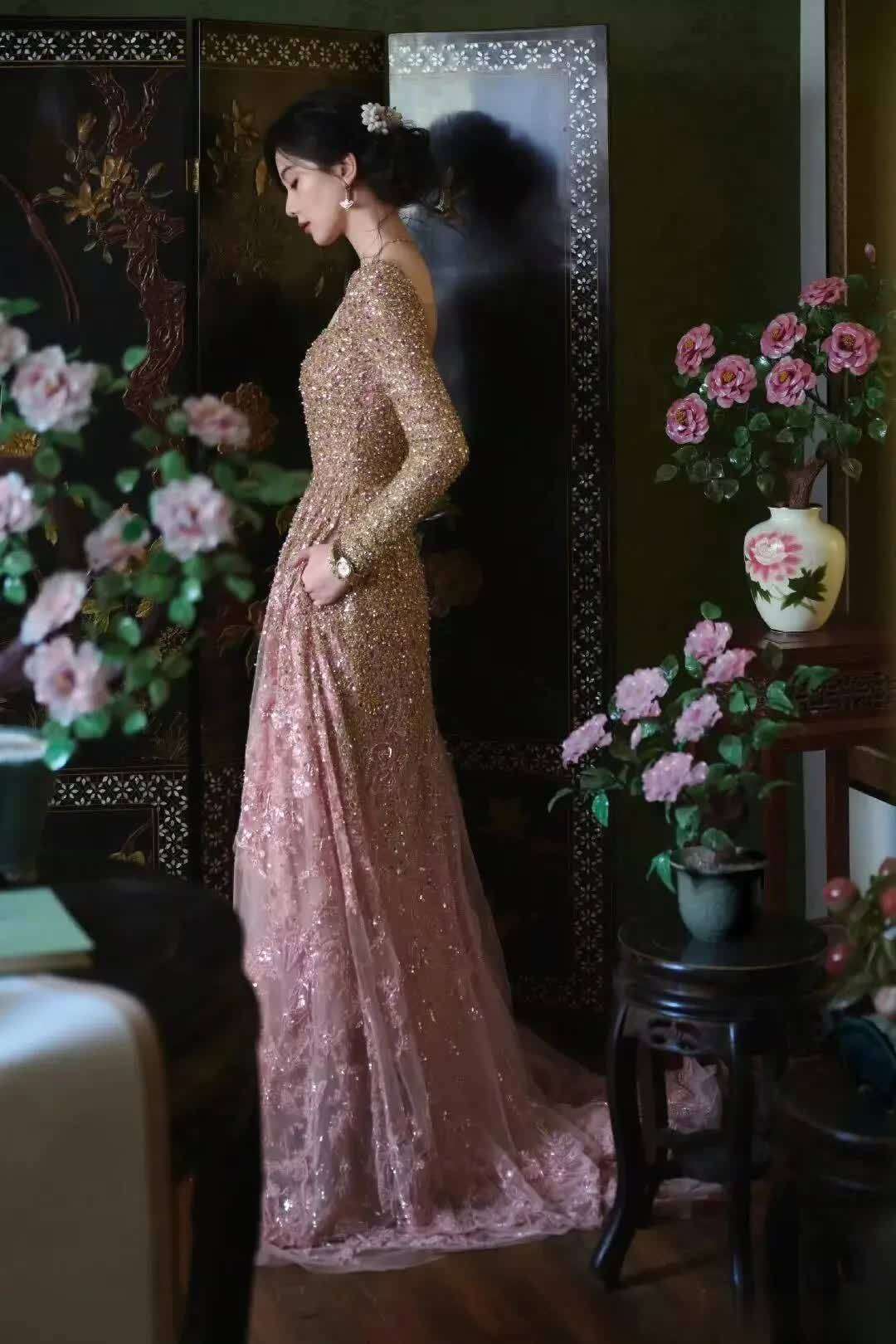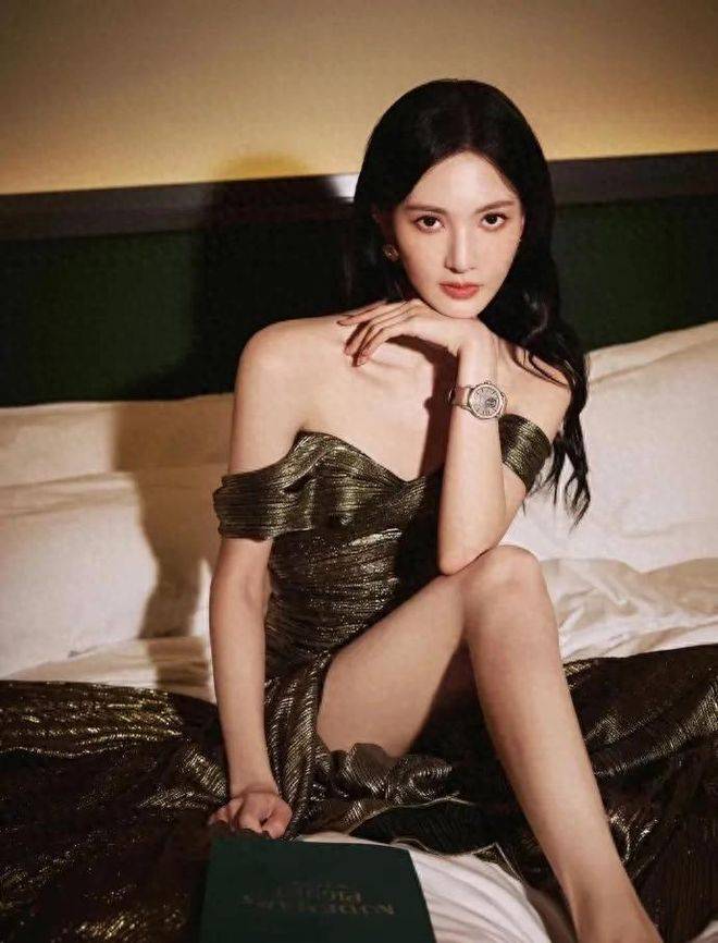 这裙子换普通人穿,大概率是“行走的反光板”显臃肿,金晨却凭舞蹈功底练出的骨相轻松驾驭。一字肩露肩颈线,高开叉衬得腿长占比过半,鎏金面料在光线下流转光泽,半倚镜子时的松弛感,既不刻意凹造型,又自带贵气滤镜。