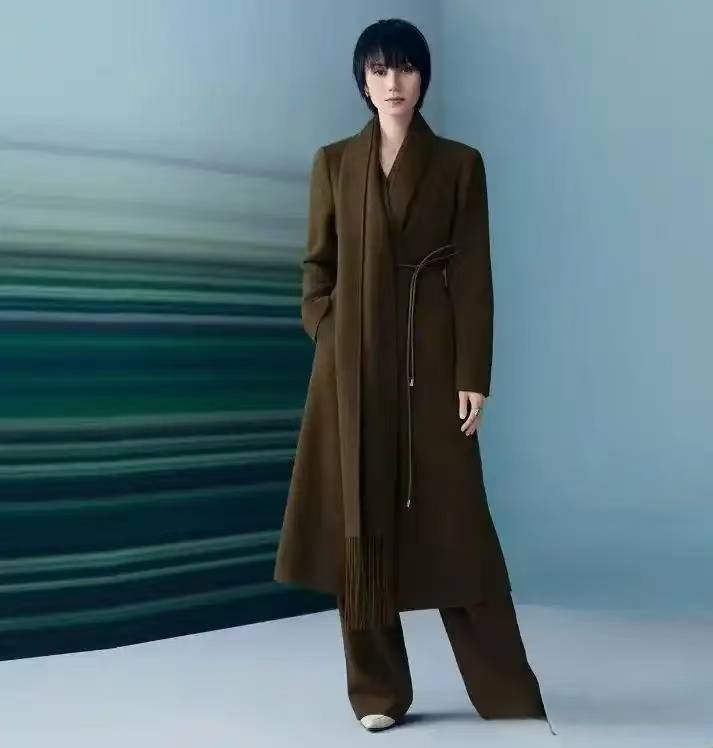 这套穿搭的亮点在于,用咖色羊毛大衣面料相同的长围巾,让这套穿搭更显气质。