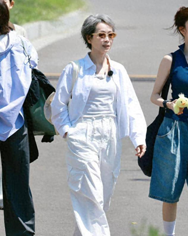 叶童的蜕变,其实是从她参加内地综艺节目开始的。 在那之前,你可能对她的印象还停留在“许仙”,或者偶尔有些被说“土气”的造型。 但节目里,她完全变了个人。 一套黑白撞色的运动造型成了教科书:里面是白色球衣套装,外面随便披件黑色短款冲锋衣,再搭上黑白条纹小腿袜和德训鞋。 就这么简单,走路带风,活力感满得快要溢出来,哪还有半点六十多岁的样子? 她自己都说,皱纹是笑出来的,遮它干嘛。 这种坦然,反而成了她最厉害的“妆饰”。