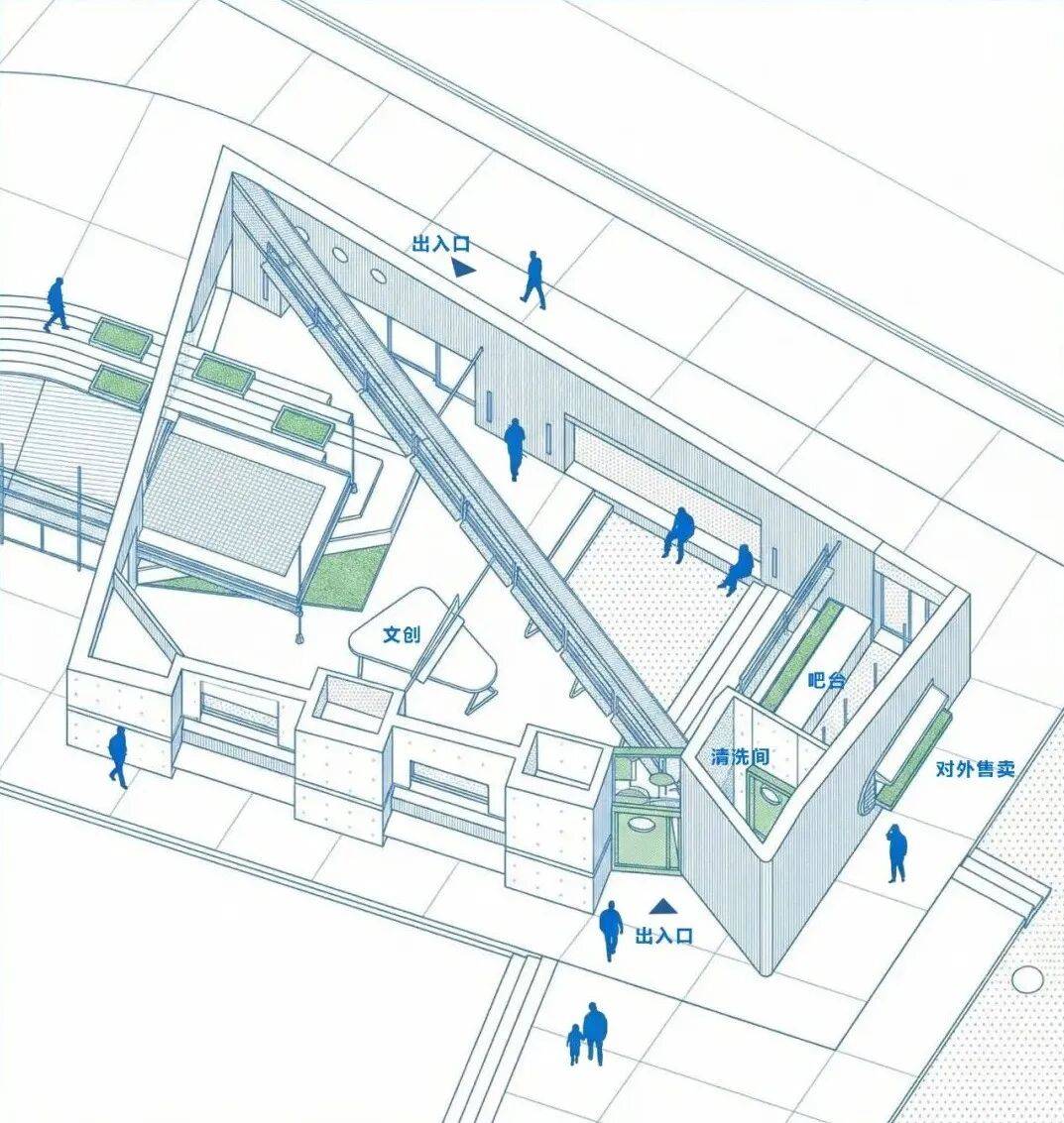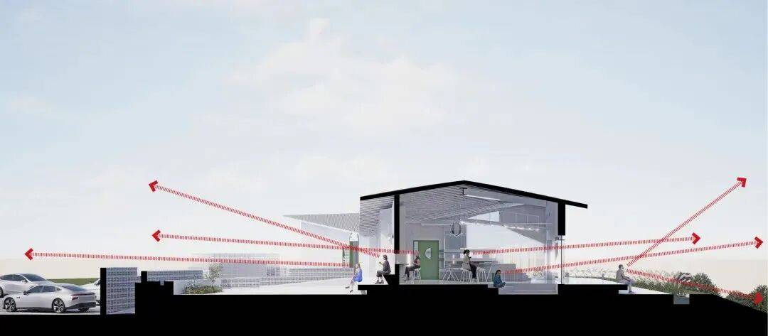 屋顶策略:绿色屋顶或光伏瓦片组成的曲面屋面,不仅降低热负荷,更在航拍视角下形成“第二层地形”,模糊建筑边界。