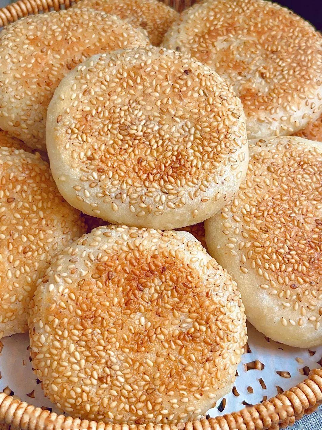 基本特点:芝麻烧饼以面粉为主料,经过发酵、擀制、涂抹油酥(如芝麻酱或香料油)、沾芝麻后烘烤而成。出炉时外皮酥脆,芝麻香气浓郁,内部层次丰富,口感软韧。