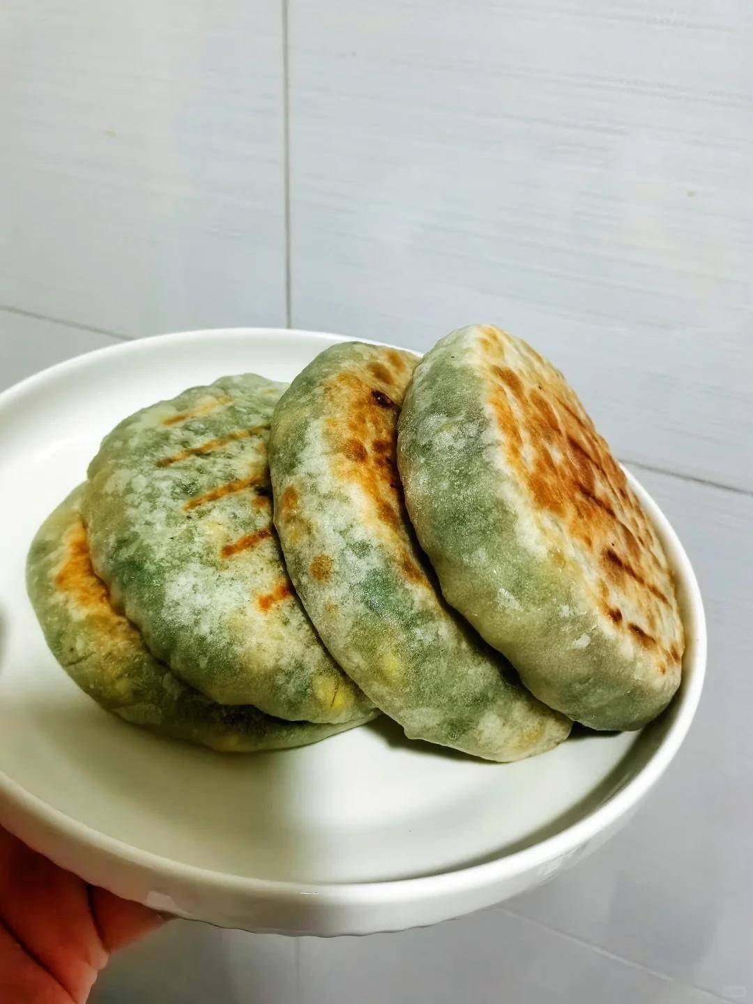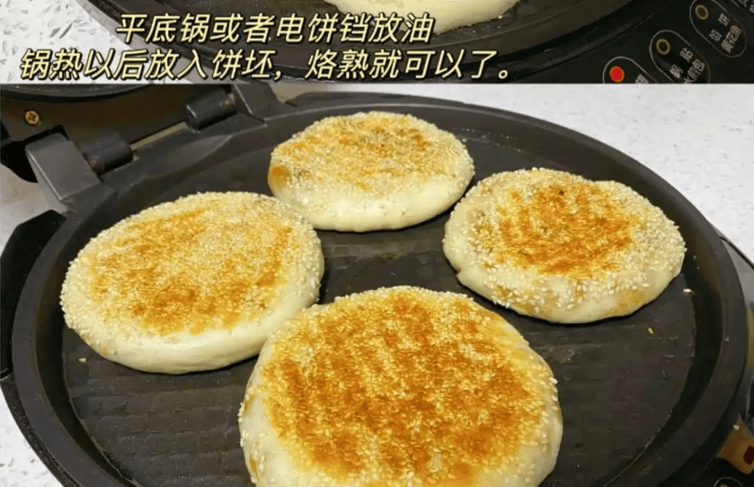 平底锅版:全程中小火,盖盖子,按一下饼的侧面能迅速回弹即熟。