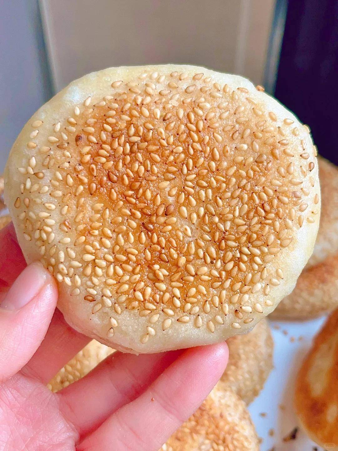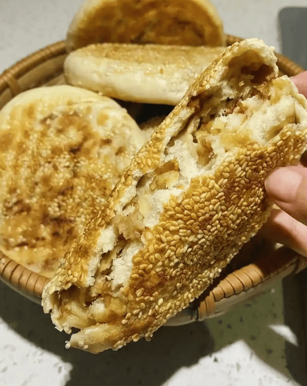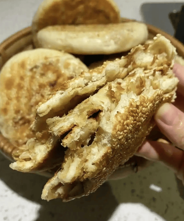 外皮酥到咬一口掉一桌子渣,根本接不住!我妈还有个绝活儿,外皮裹一层白芝麻,烙完那香味儿,直接香到让人脑子放空。外脆里软,芝麻香混着肉香,我一口气炫两个都不带停的。而且这烧饼特百搭,猪肉、牛肉馅随便换,甚至还能做素馅,怎么吃都不腻。