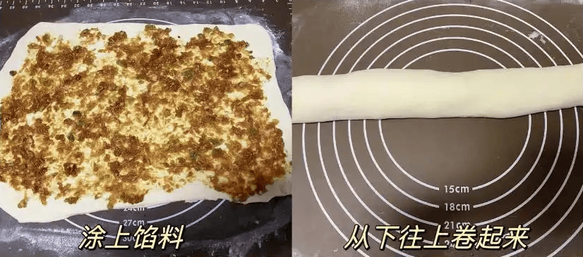 抹油酥手法:用“三叠被”法,面团擀平抹油酥,叠三层转90度再擀开,重复三次。