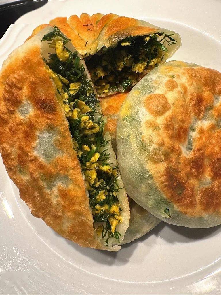 刚出锅的馅饼要放在竹筐里散汽, 摞着放会毁了脆皮。咬开前先欣赏横截面:半透明的面皮裹着翡翠般的茴香馅,肉汁欲滴不滴地挂在切口上。