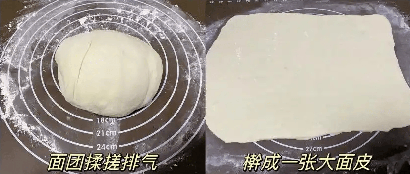 发好的面团放案板上,揉一揉排气。擀成一张大面皮。