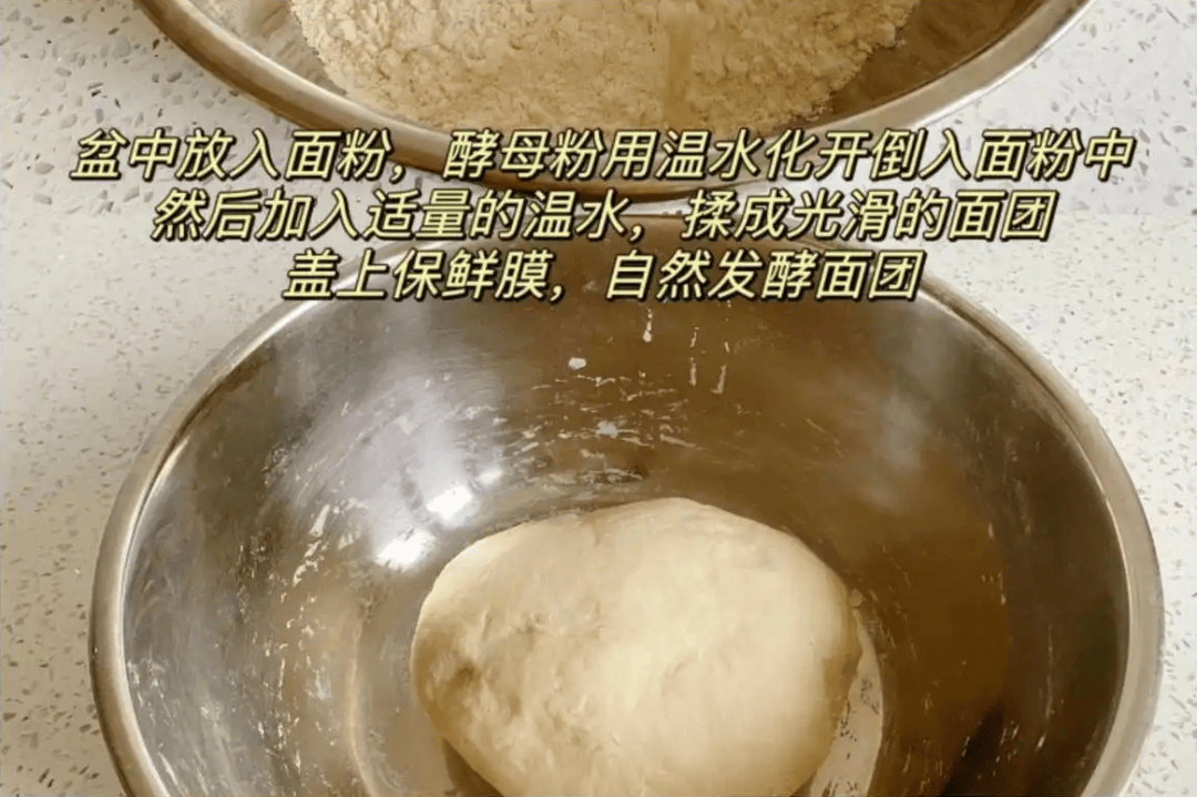 面粉倒进盆里,酵母用温水化开,边倒边搅成絮状后上手揉至表面光滑,盖上盖子醒发至两倍大。