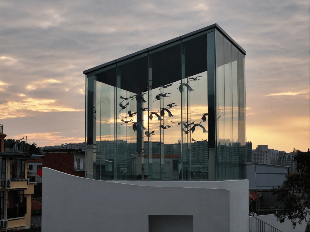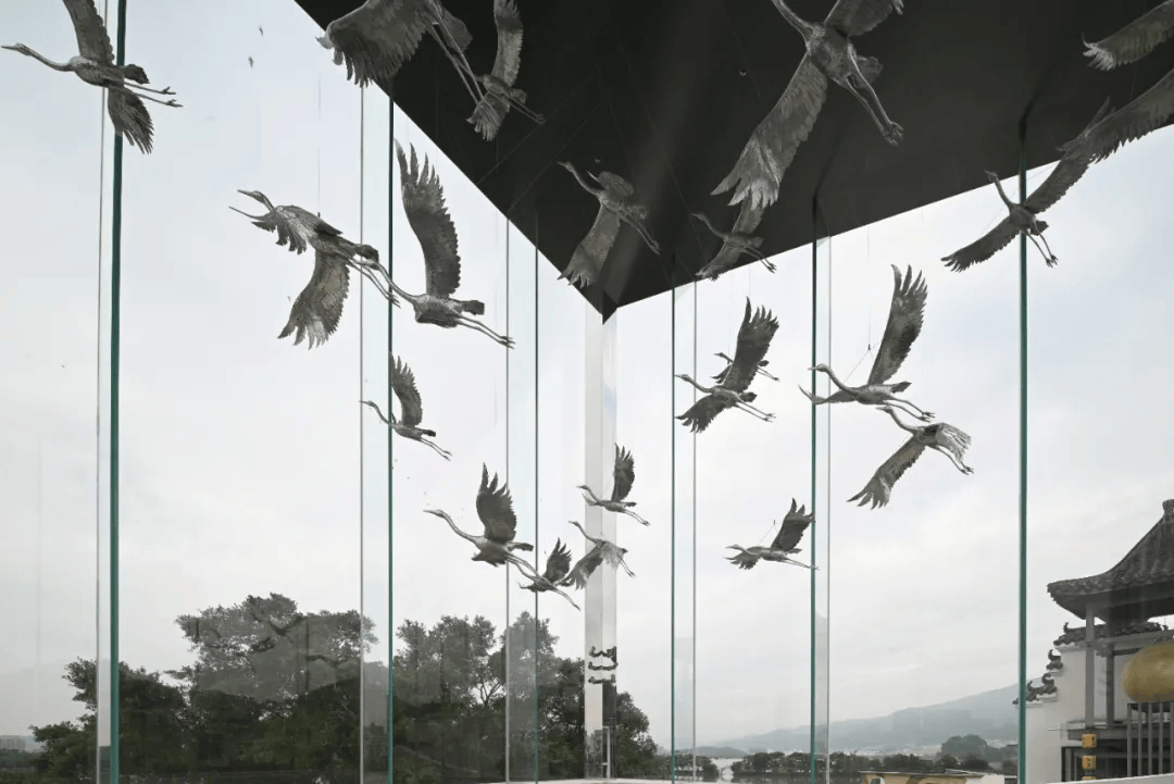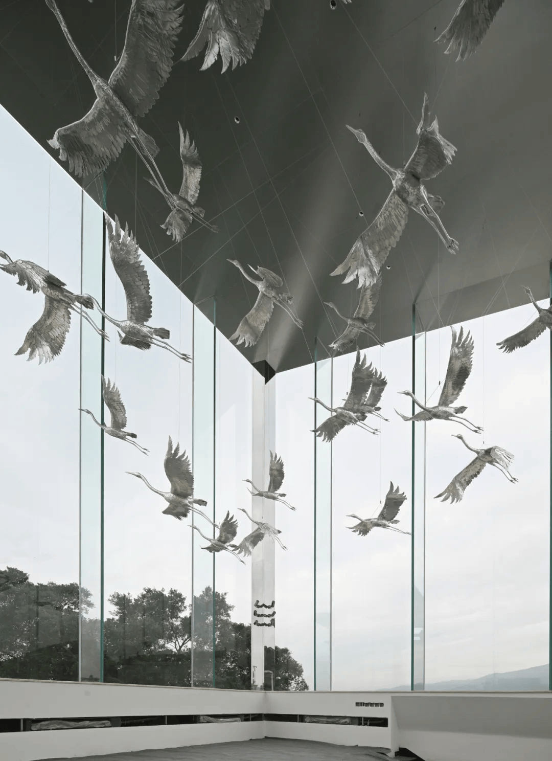 作为艺术节的核心节点,建筑内部设置“飞鹤展厅”。团队以星湖湿地的代表性生物——灰鹤为灵感,在玻璃盒中构筑艺术装置:灰鹤掠过湖面,飞向城市天际。