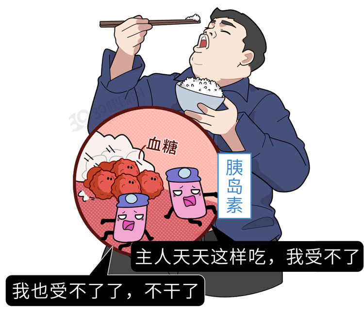 然而随着人们饮食的不节制,葡萄糖含量暴涨,导致胰岛素疯狂加班,长期下来胰岛功能越来越弱,并出现胰岛素抵抗,血糖也就开始超标,身体供能受影响,为了补充能量只能加大进食欲望,也就是多吃,吃的多了血糖负担又加重了。