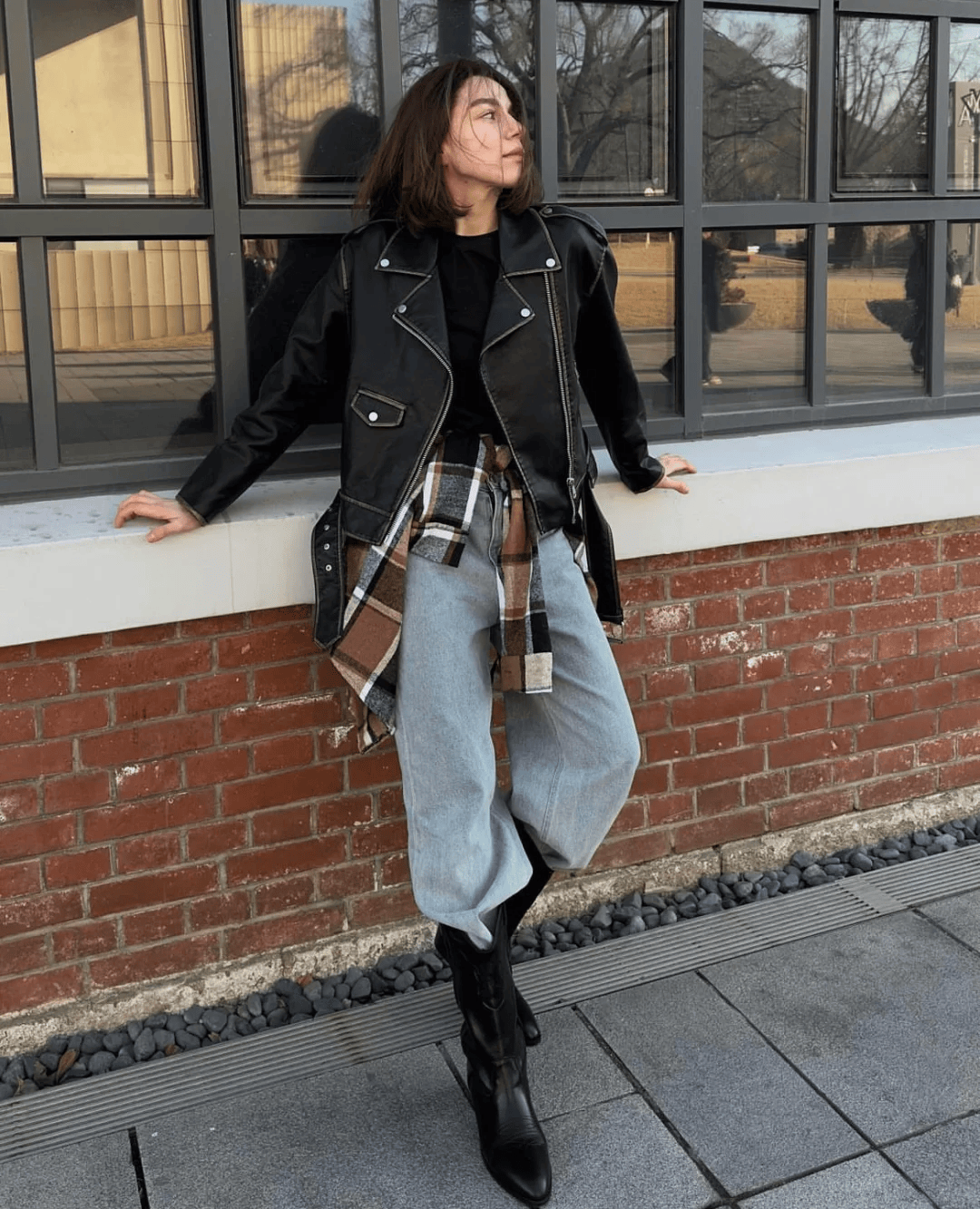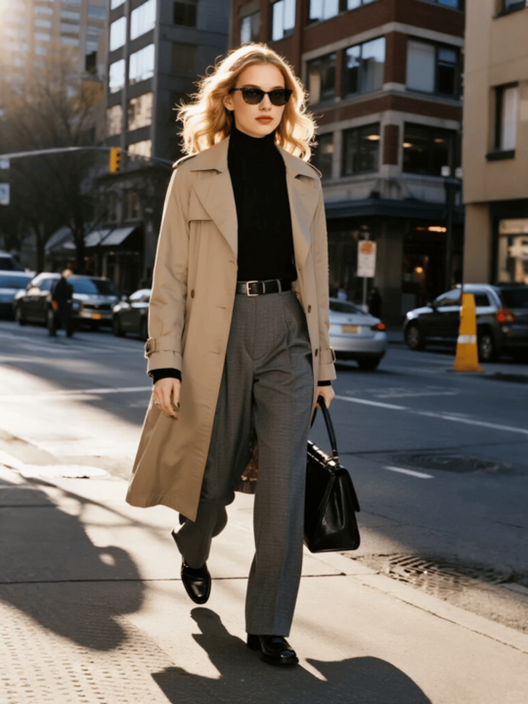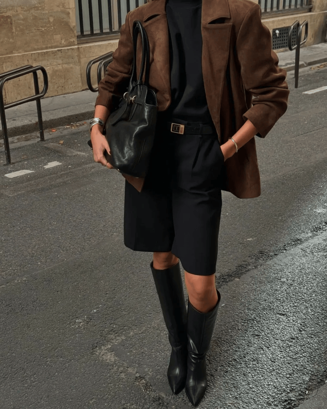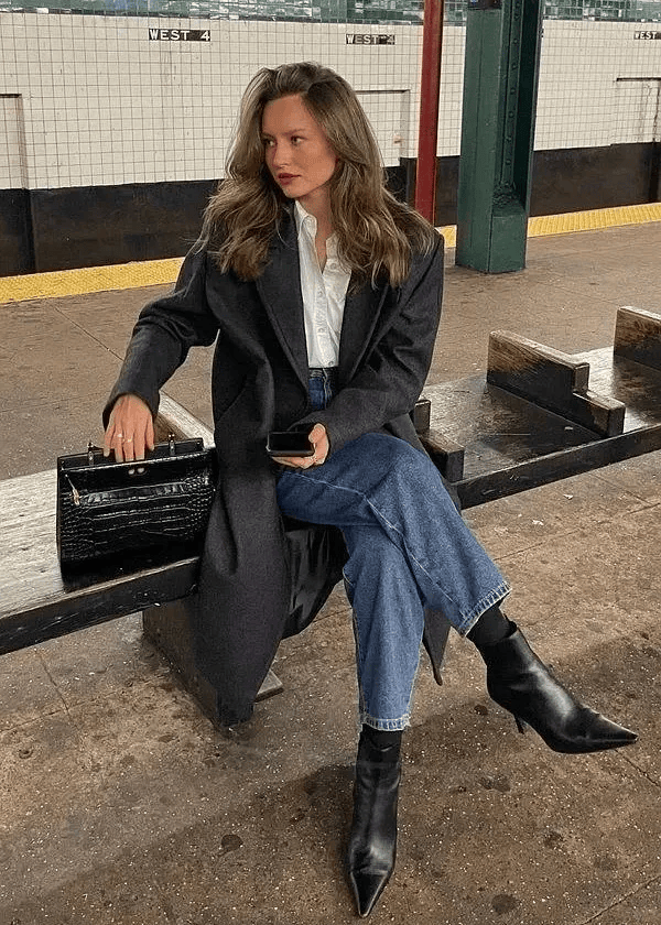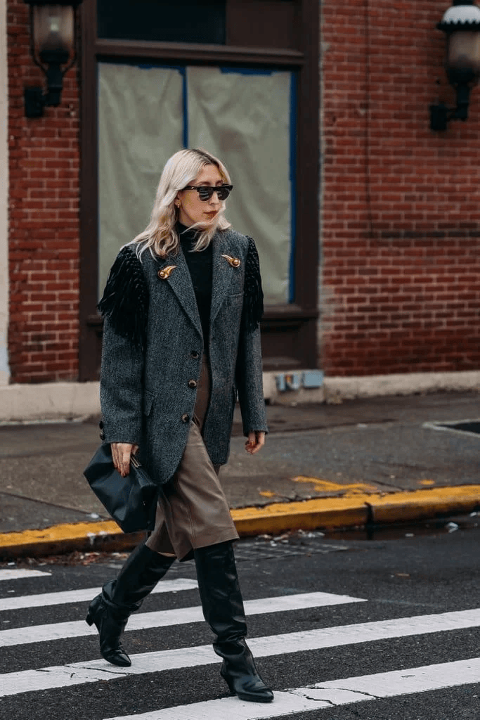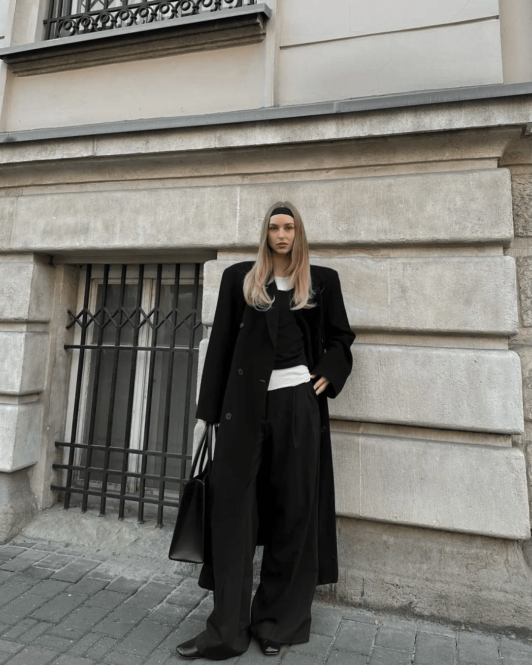 小黑裤+黑靴:紧身小黑裤配黑靴,上衣选oversize大衣,上松下紧,显瘦又显高。