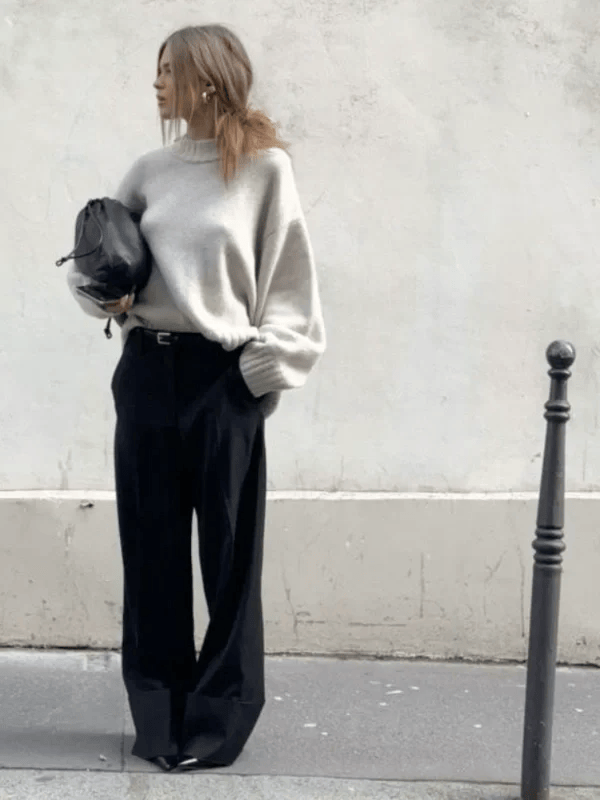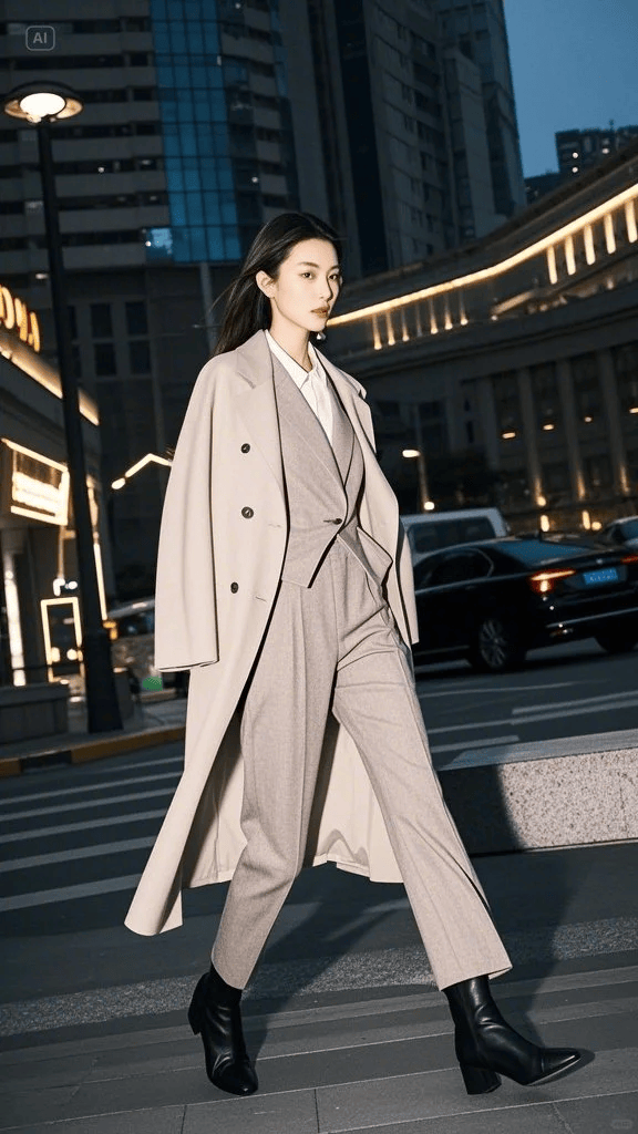 阔腿裤的宽松感容易显矮,因此要选高腰+略长的版型(裤脚刚好盖住靴面1/3),搭配粗跟短靴,平衡宽松感。比如:高腰阔腿裤配粗跟短靴,露出一点鞋尖,既保留了阔腿裤的气场,又不会显矮。