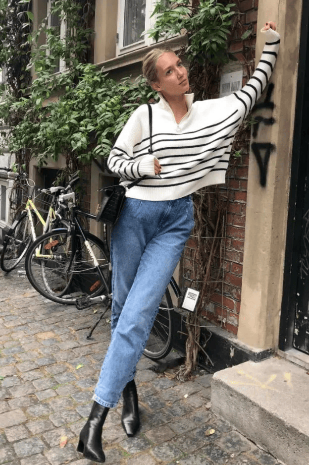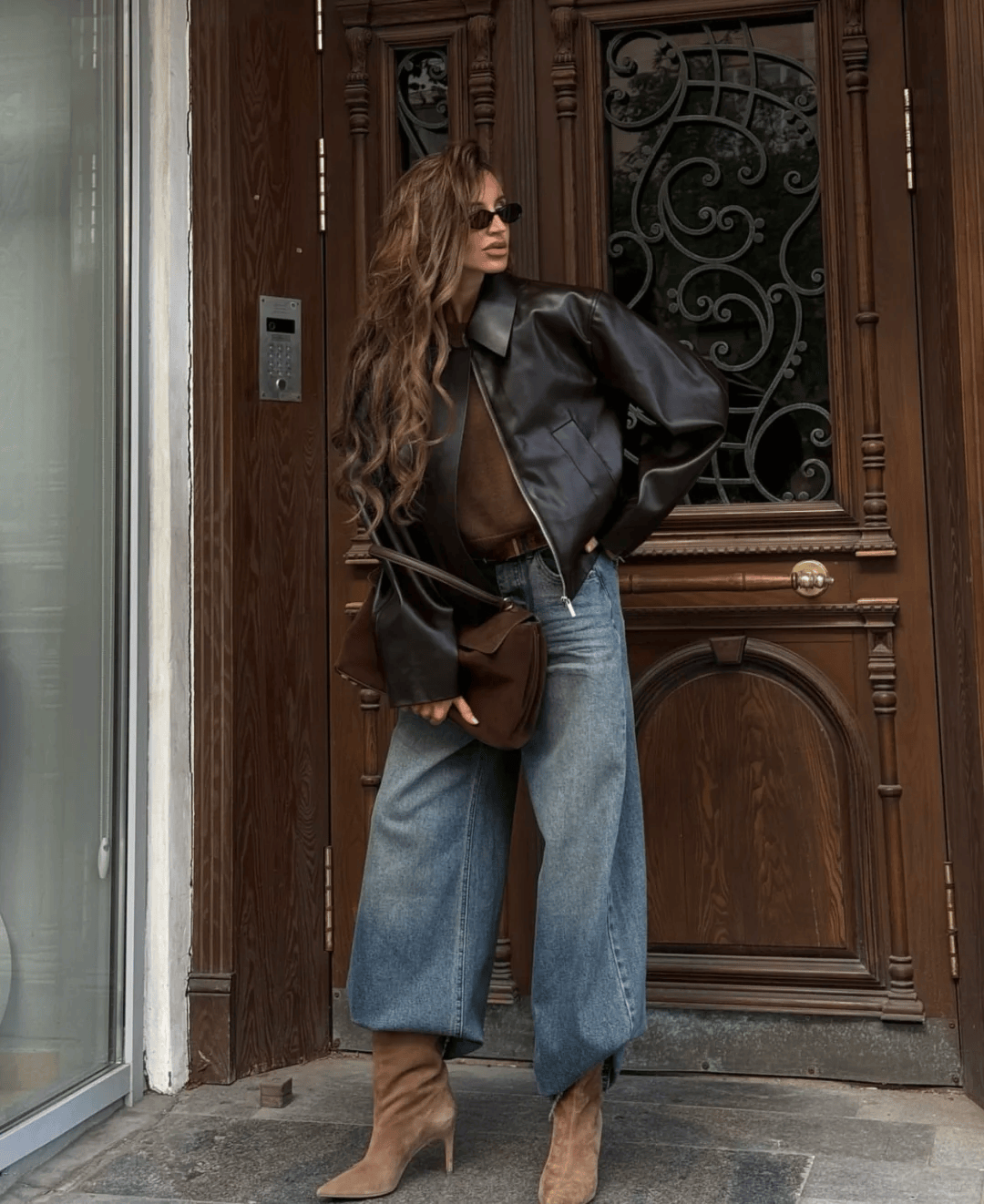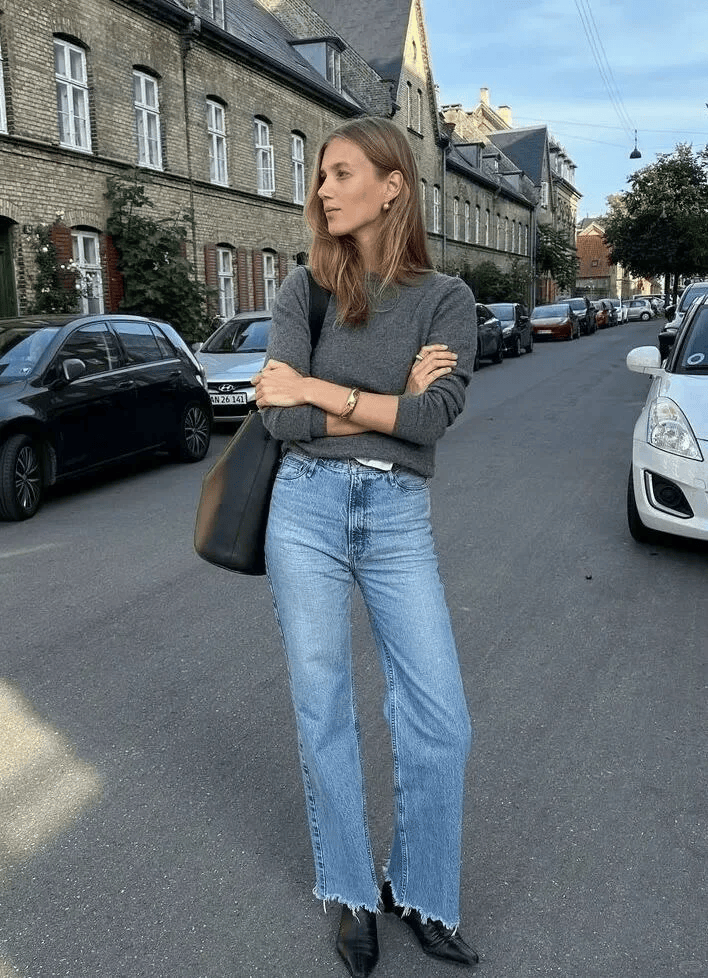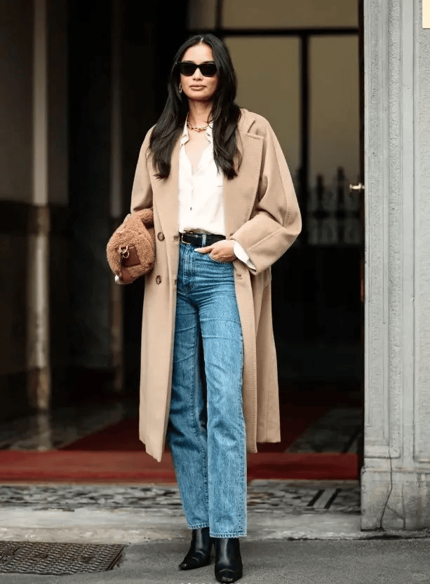 直上直下的线条能修饰腿型(比如O型腿、X型腿),高腰设计更能拉长下半身比例。搭配短靴或马丁靴时,裤脚刚好盖过靴口,形成“腿+靴”的连贯线条,视觉上腿长直接翻倍。比如:高腰直筒牛仔裤配棕色短靴,上衣塞衣角,秒变“腿精”。