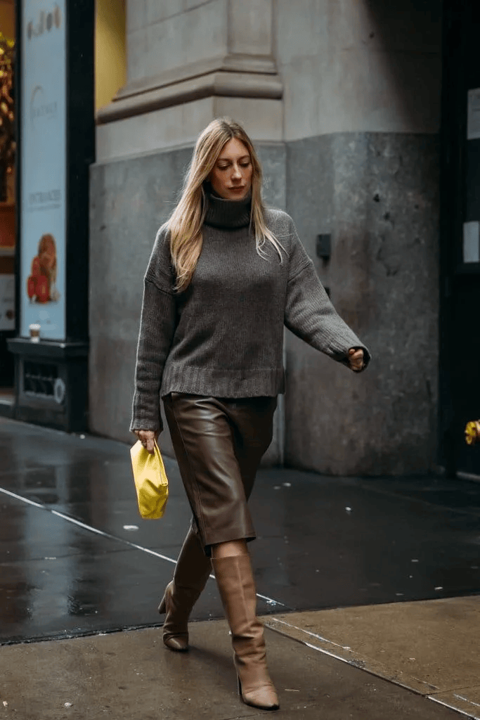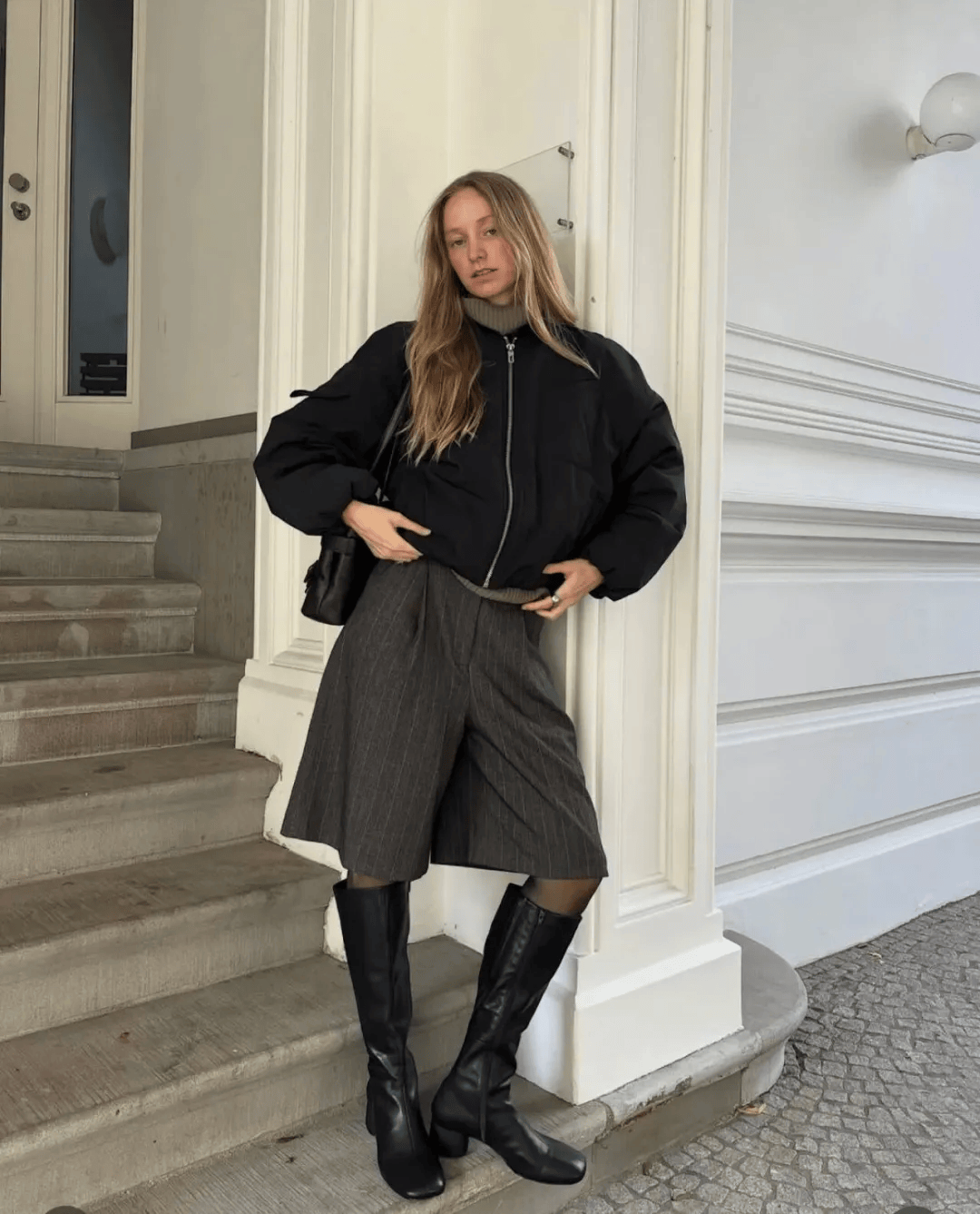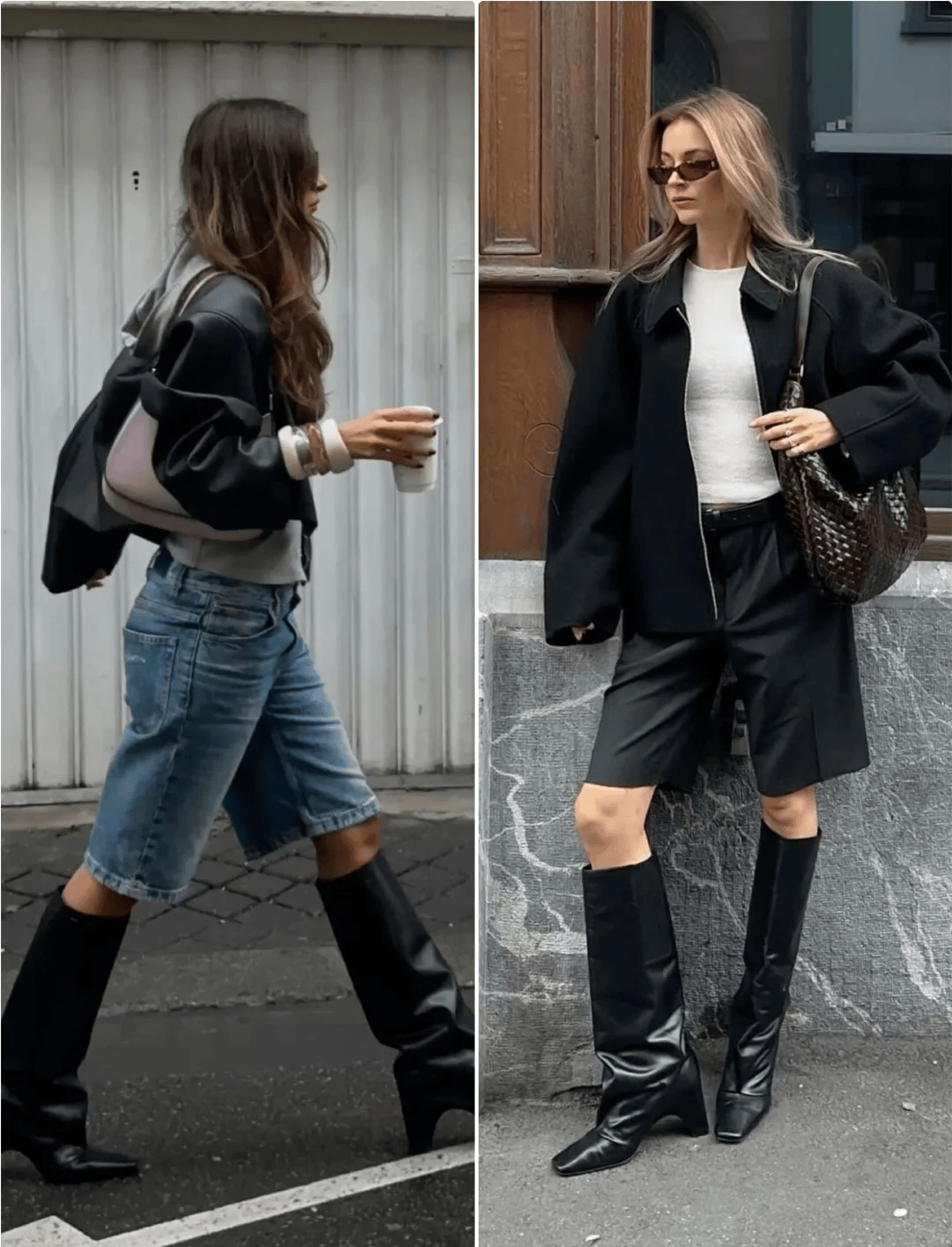 长筒靴能包裹腿部,尤其是高腰长筒靴,搭配紧身小黑裤或直筒裤,能直接“拉长”腿部线条,适合腿型直的女生。比如:长筒靴配紧身小黑裤,上衣选短款大衣,显高又有气场。