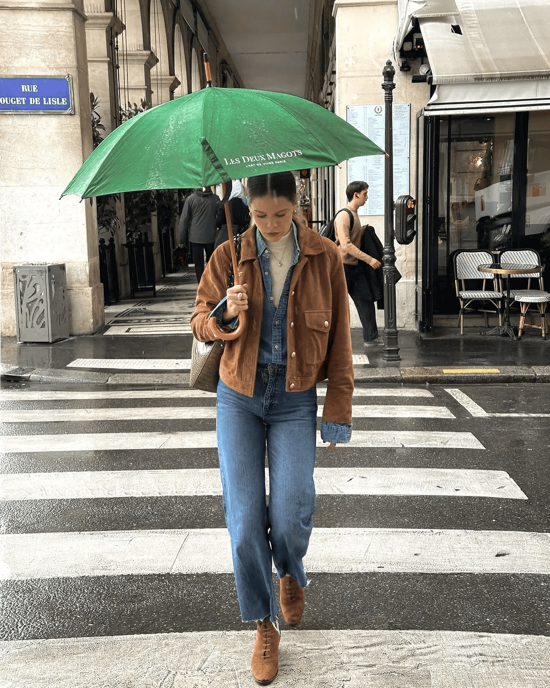 马丁靴的厚底和硬挺靴筒能增加“力量感”,搭配直筒牛仔裤或九分裤,显帅又显腿长。比如:oversize棉服配直筒牛仔裤+马丁靴,上松下紧,显瘦又显高。