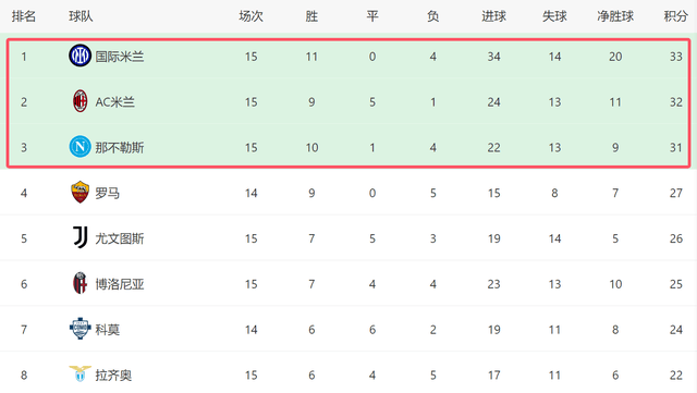 目前,国际米兰以1分优势排名第一,AC米兰和那不勒斯分列第二、第三位,前三强之间的积分差距仅为2分,意甲争冠悬念进一步加剧,后续每一轮比赛都可能改变排名格局