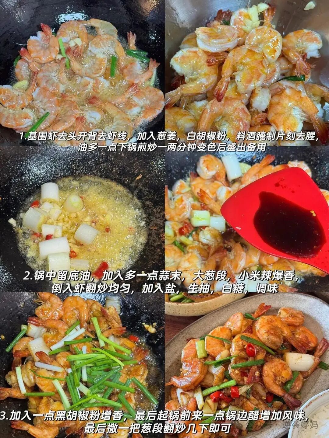 1.基围虾去头开背去虾线,加入葱姜,白胡椒粉,料酒腌制片刻去腥,油多一点下锅煎炒一两分钟变色后盛出备用 2.锅中留底油,加入多一点蒜末,大葱段,小米辣爆香,倒入虾翻炒均匀,加入盐,生抽,白糖,调味 3.加入一点黑胡椒粉增香,最后起锅前来一点锅边醋增加风味,最后撒一把葱段翻炒几下即可 蒜蓉空心菜