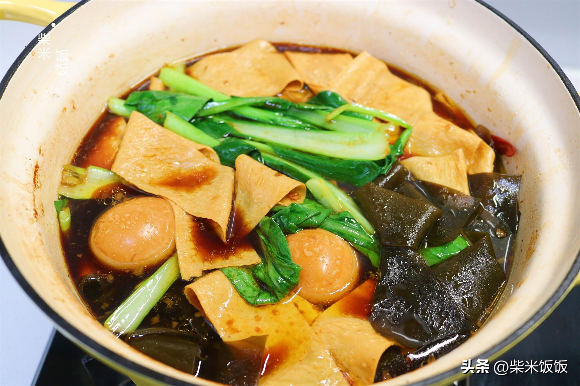 7,牛肉捞出来,我又煮了一些海带、豆腐皮和青菜。这样肉、菜、蛋一锅出,简单省事又好吃。