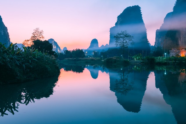 遇龙河的竹筏更安静些,撑筏的人一竿子下去,水声清亮。到了阳朔,西街晚上热闹,但更让人留恋的是早晨,雾气还没散尽,远近的山都朦朦胧胧的,像是还没睡醒。桂林的米粉要吃街边小店的,加一勺酸豆角,味道比大饭店的实在多了。